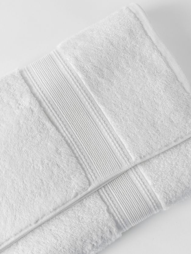 The crisp white tone paired with subtle woven borders gives this towel a timeless, spa-like appearance. Its clean design fits effortlessly into modern bathrooms, luxury homes, and hospitality settings.